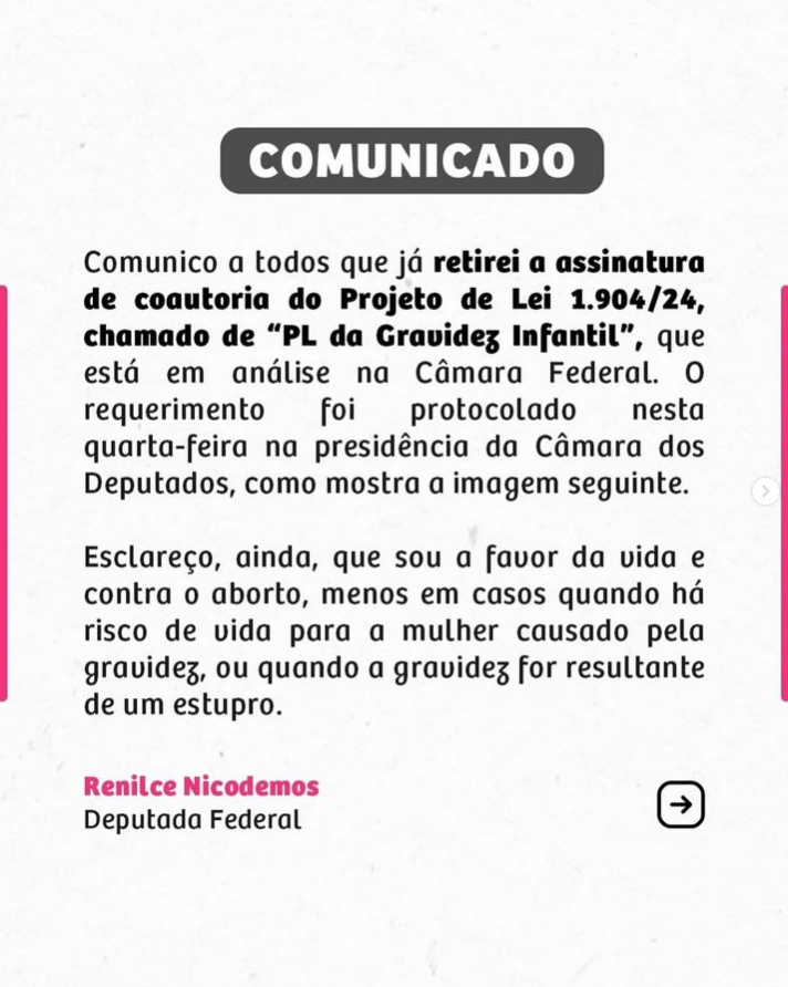 Renilce Nicodemos informou a retirada da assinatura nessa quarta-feira, 12, antes da votação da urgência do PL na Câmara dos Deputados. A parlamentar alegou que é a favor da vida e contra o aborto, “menos em casos quando há risco de vida para a mulher causado pela gravidez, ou quando a gravidez for resultante de um estupro“, casos em que o procedimento é legalizado pela legislação brasileira.