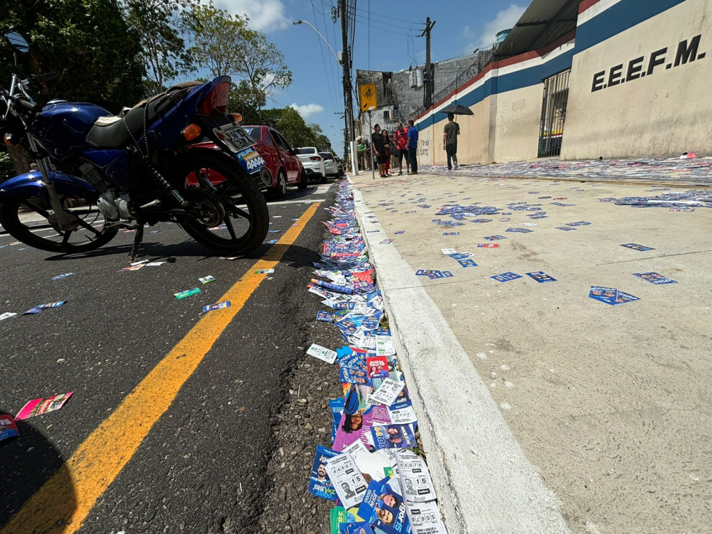 BELÉM (PA) – Na manhã deste domingo, 6, eleitores que se dirigiram à Escola Jarbas Passarinho, localizada no bairro do Marco, em Belém, depararam-se com uma cena comum, porém ilegal: o derrame de santinhos em frente ao local de votação. Folhetos de diversos candidatos foram jogados nas proximidades da escola, formando um tapete de papéis que cobria as calçadas e entradas.