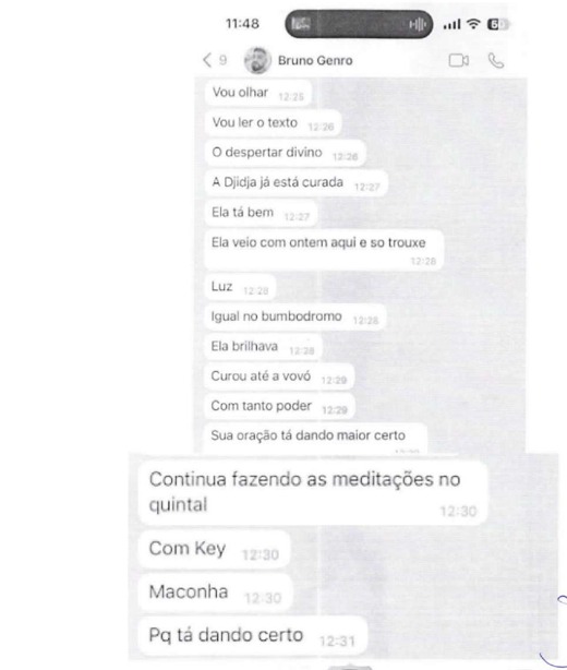 Após a apreensão do celular de Cleusimar Cardoso durante a primeira primeira fase da Operação Mandrágora, os investigadores tiveram acesso a uma conversa de Bruno Roberto com a ex-sogra. O ex-namorado de Djidja afirma acreditar que ele, Cleusimar e Verônica Seixas, gerente de uma das unidades do salão de beleza, fazem parte de uma “trindade”. Bruno diz que Djidja teria curado avó e incentiva a ex-sogra continuar fazendo o uso de “key”, uma referência à substância Cetamina.