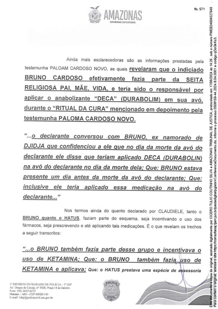 Depoimento prestado por uma testemunha, identificado como Paloam Cardoso Novo, que consta nos autos do processo, indica que Bruno Roberto fazia parte da seita religiosa efetivamente e que ele teria confidenciado ao depoente a aplicação de “Deca”, o anabolizante Deca-Durabolin, na avó de Paloam e da Djidja, durante um suposto ritual de cura. A idosa faleceu no dia 29 de junho de 2023. No dia anterior, 28 de junho, a testemunha teve conhecimento de que havia acontecido um ritual da cura, onde por volta das 18h fizeram a aplicação da bomba. Além disso, ele declarou que também teriam ministrado maconha para que a idosa pudesse meditar.