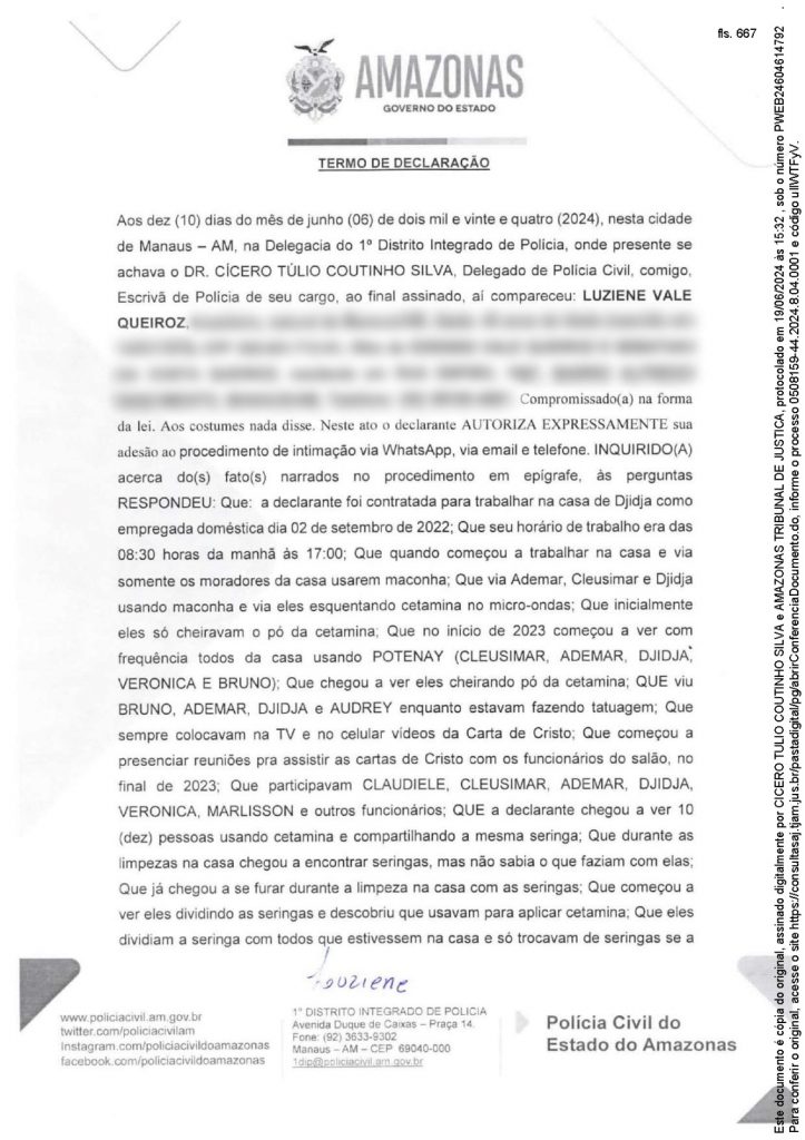 No dia 10 de junho, a testemunha identificada como Luziene Vale Queiroz, empregada doméstica da família Cardoso, declarou pontos que até então, não havia sido exposto. De acordo com a declarante, a prestadora de serviço foi contratada em 2022 e neste ano, Ademar, Djidja e a mãe, Cleusimar, faziam uso de maconha e que colocavam a Cetamina no micro-ondas para virar pó.