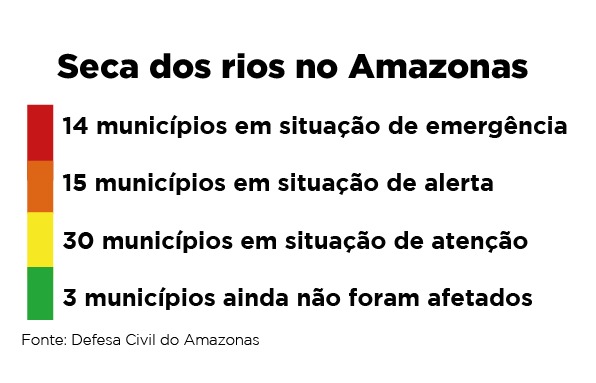 Das 62 cidades, 14 estão em situação de emergência, de acordo com a Defesa Civil. A região compreende as calhas do Juruá, Médio e Alto Solimões, que somam mais de 413 mil habitantes. O órgão também monitora 15 municípios em situação de alerta e 30 em atenção. Apenas três estão dentro da normalidade.
