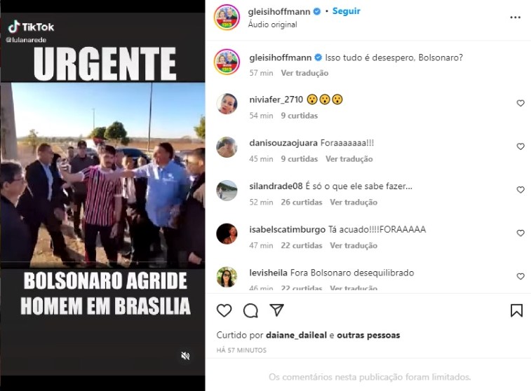 No Instagram, a candidata à reeleição e presidente Nacional do Partido dos Trabalhadores (PT), Gleisi Hoffmann, compartilhou o vídeo e questionou “Isso tudo é desespero, Bolsonaro?”.