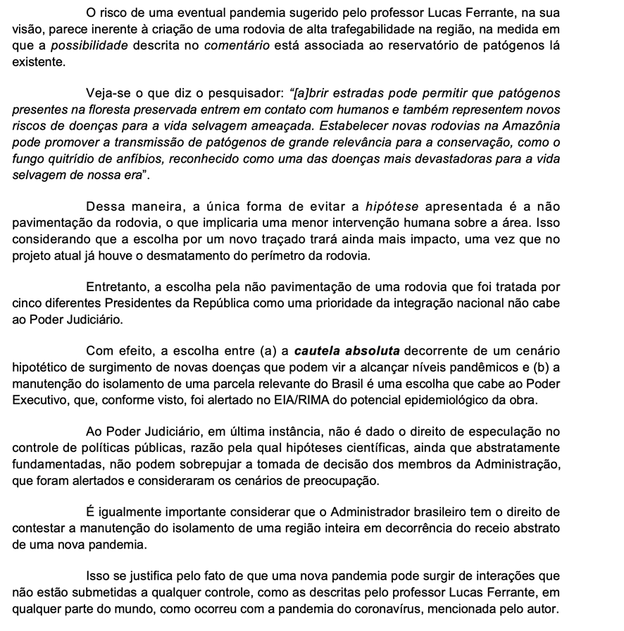 Destaca-se ainda que não estamos tratando de um local qualquer no mundo, mas sim do maior reservatório zoonótico do planeta, que está sendo aberto agora, conforme destacado pela Nature e The Lancet, maior periódico científico do mundo e maior periódico médico do mundo respectivamente. Em suma, embora existam evidências robustas publicadas em periódicos científicos, o desembargador parece considerar que sua compreensão do tema supera a dos especialistas, editores e revisores desses periódicos. É importante ressaltar que o risco de surgimento de uma nova pandemia na Amazônia tem sido amplamente reconhecido por diversos grupos de pesquisa, refletindo um consenso científico sobre essa preocupação, como exemplo as publicações lideradas pela Gisele Winck (Fiocruz), em artigo publicado na Science Advances, e Joel Henrique Ellwanger (Universidade Federal do Rio Grande do Sul), em publicação nos Anais da Academia Brasileira de Ciências, além de outros. Dessa forma, ele comete o mesmo erro daqueles que desconsideraram o risco de uma segunda onda de COVID-19 em Manaus, considerada hipotética na época, quando alertamos sobre o perigo no periódico Nature Medicine.