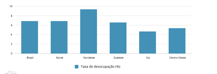 No gráfico, a Região Nordeste apresenta a maior taxa de desocupação entre as regiões brasileiras, acima de 8%. Isso indica que o Nordeste enfrenta os maiores desafios em termos de emprego no País, superando outras regiões como o Sul e o Centro-Oeste, que apresentam taxas de desocupação mais baixas. A Região Norte apresenta uma taxa de desocupação próxima a 7%, posicionando-se acima da média nacional. O Sul registra a menor, abaixo de 6%.