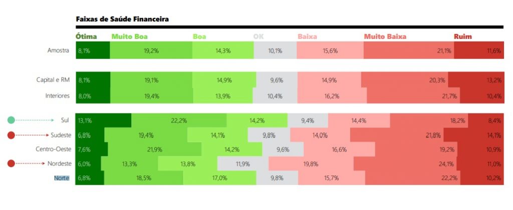 Entre as regiões do País, a Sudeste, com 14,1%, teve o maior percentual de pessoas na faixa de saúde financeira ruim, de 0 a 36 pontos. Na mesma situação, aparece a Região Nordeste, com 11%. Em seguida, surge as regiões Centro-Oeste (10,9%), Norte (10,2%) e Sul (8,4%).