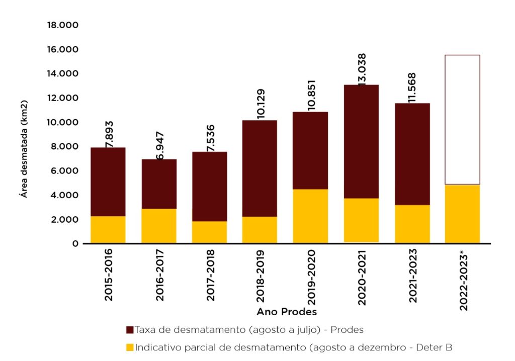 Já para 2023, o Imazon estima que o bioma pode perder quase 12 mil quilômetros quadrados até dezembro se o desmatamento seguir o ritmo atual: quase 10 vezes o tamanho da cidade do Rio de Janeiro.