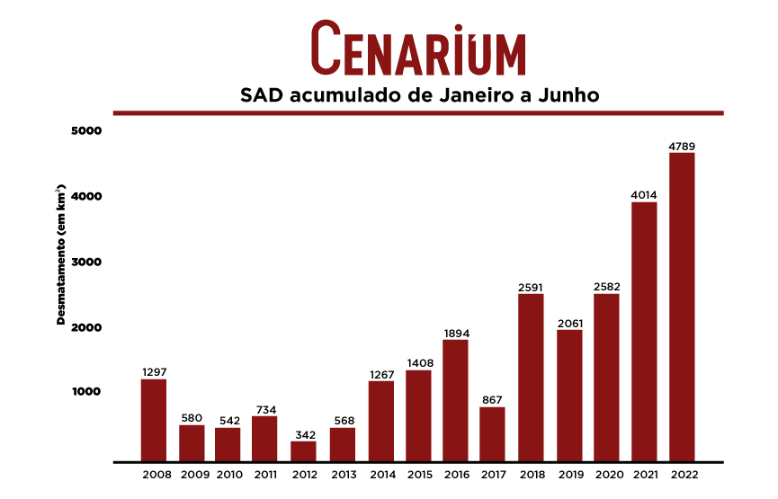 Junho, sozinho, também foi devastador. O desmatamento avançou sobre 1.429 km² apenas no mês passado; área semelhante à grande São Paulo. Com esse alcance, a exploração de recursos da floresta aumentou 54% em comparação a junho de 2021.