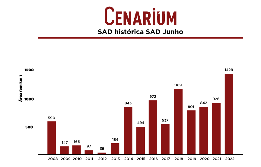 Essa destruição é resultado de recordes sucessivos, registrados mensalmente pelo Sistema de Alerta de Desmatamento (SAD) do Instituto do Homem e Meio Ambiente da Amazônia (Imazon), como o que foi registrado no mês passado: 1.429 km² em apenas 30 dias; um aumento de 54% quando comparado com o mesmo período em 2021.