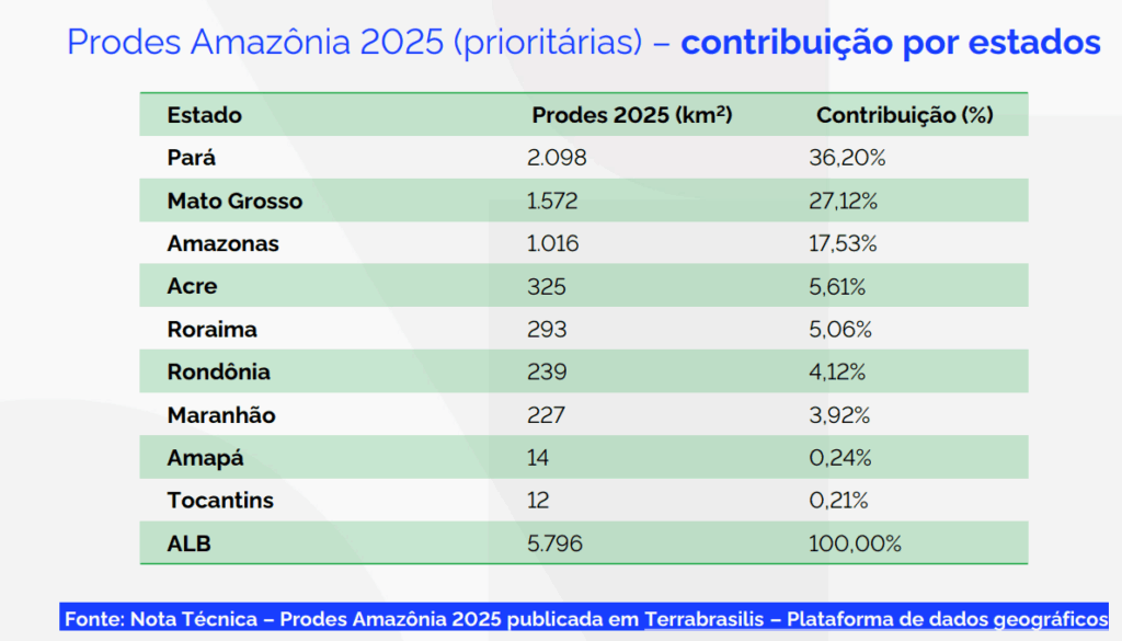 Entre os nove Estados que compõem a Amazônia Legal, o Pará lidera em área desmatada, com 2.098 km² de florestas derrubadas, ou 36,2% do total do bioma. Anfitrião da 30ª Conferência das Nações Unidas Sobre Mudança do Clima (COP30), que começa em novembro em Belém (PA), o Estado também registrou a menor queda na taxa de desmatamento de 2024 para 2025, com 12,4% de redução, resultado considerado positivo pelo MMA porque mantém a tendência de redução ativa.