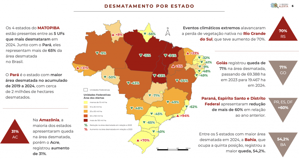 Pelo segundo ano consecutivo, o Estado do Maranhão lidera o ranking do desmatamento, mesmo com redução de 34,3% na área desmatada, totalizando 218.298,4 de hectares de vegetação nativa perdida em 2024. O MapBiomas esclareceu que os quatro Estados do MATOPIBA estão presentes entre as cinco unidades da federação que mais desmataram em 2024. Junto com o Pará, representam mais de 65% da área desmatada no Brasil.