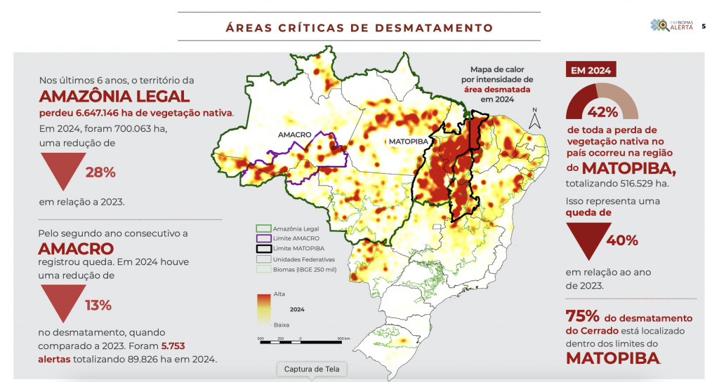 Cerrado e Amazônia são responsáveis por mais de 83% da área desmatada no País, segundo o relatório. O Cerrado apresentou queda de 41% nas áreas desmatadas em 2024, comparada a 2023, ainda assim, lidera o ranking, pois concentra 52,5% do desmatamento total. A pressão maior ocorre na área conhecida com MATOPIBA, formada por áreas nos Estados do Maranhão, Tocantins, Piauí e Bahia, onde estão 75% do desmatamento do bioma.