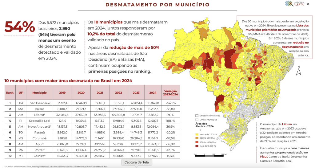 O levantamento mostra que, dos 5.572 municípios brasileiros, 2.990 (54%) tiveram pelo menos um evento de desmatamento detectado e validado em 2024. Os dez que mais desmataram, ano passado, responderam por 10,2% do total de desmate validado no País.