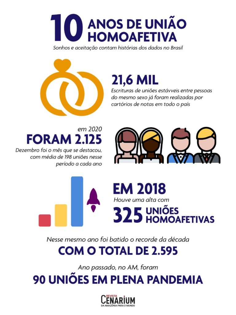 Segundo a Anoreg Brasil, mais de 21 mil casais homoafetivos oficializaram a união estável no País. No Amazonas, no ano de 2019, foram 103 enlaces oficializados. De 2011 até ano passado no Estado, o crescimento de união estável foi 260%. Mesmo com muita luta e o reconhecimento pelo STF, em 2011, apenas em maio de 2013, por meio da Resolução 175, publicada pelo o Conselho Nacional de Justiça (CNJ), é que a união homoafetiva passou a valer no Brasil.