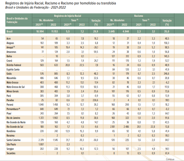 Enquanto o racismo é entendido como um crime contra a coletividade, a injúria é direcionada ao indivíduo. Neste segundo caso, a situação muda: o Distrito Federal tem a maior incidência (633 casos), seguido de Santa Catarina (1.545 casos) e Mato Grosso do Sul (468 casos). Estados como São Paulo e Espírito Santo tiveram alguns dados indisponíveis, no momento da pesquisa, que cruzou números de secretarias estaduais de segurança pública, polícias, dados do Censo do Instituto Brasileiro de Geografia e Estatística (IBGE) e Fórum Brasileiro de Segurança Pública.