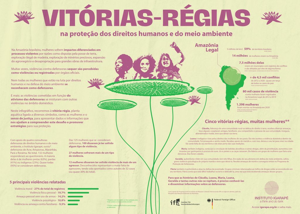 MANAUS — O Instituto Igarapé realizou uma pesquisa inédita que apontou que oito em cada dez defensoras de direitos e do meio ambiente já sofreram algum tipo de violência na Amazônia brasileira (Veja infográfico ao final da matéria). As informações foram divulgadas por meio do infográfico ‘Vitórias-régias na proteção dos direitos humanos e do meio ambiente’, no dia 1º de fevereiro desse ano.
