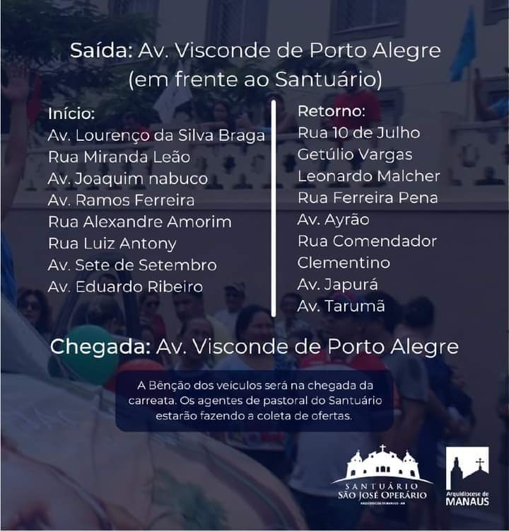 Às 17h30, começa concentração da carreata, também em frente ao santuário. Os crentes percorrerão por avenidas como a Joaquim Nabuco, Ramos Ferreira, 7 de Setembro, Leonardo Malcher e Tarumã. De acordo com Wania Braga, da equipe de organização das celebrações do santuário, a comunidade vive um momento importante da festa, que é marcada pelo ano de São José.