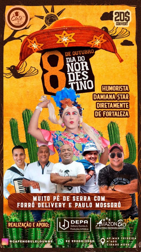 MANAUS – Para celebrar o Dia do Nordestino, comemorado em 8 de outubro, o Restaurante Temático Nordestino Café no Bule Lounge preparou uma programação imperdível, que conta com a presença da ‘Galega do Humor’, ‘Damiana Star’. A personagem é conhecida no Nordeste por seus shows de humor na Av. Beira Mar, em Fortaleza.