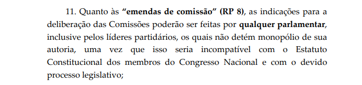 “As indicações para a deliberação das Comissões poderão ser feitas por qualquer parlamentar, inclusive pelos líderes partidários, os quais não detém monopólio de sua autoria, uma vez que isso seria incompatível com o Estatuto Constitucional dos membros do Congresso Nacional e com o devido processo legislativo”.