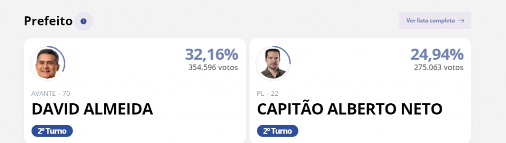 Em Manaus, capital do Amazonas, o atual prefeito, David Almeida, do Avante, disputará o 2° turno contra o deputado federal Alberto Neto, do Partido Liberal (PL). Os dois tiveram, respectivamente, 32,16% (354.596) e 24,94% (275.063) dos votos válidos.