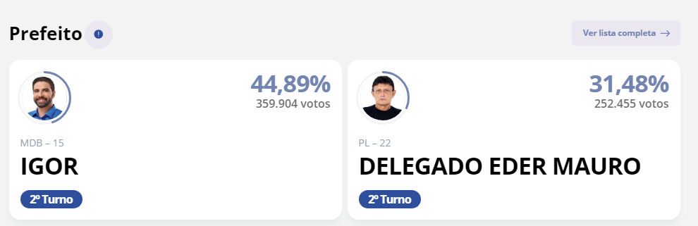 Belém, capital do Pará, também terá segundo turno no dia 27 de outubro. A disputa será entre Igor Normando (MDB), o candidato mais votado, com 44,89% (359.904) dos votos válidos, e o Delegado Eder Mauro (PL), que terminou a apuração com 31,48% (252.455).