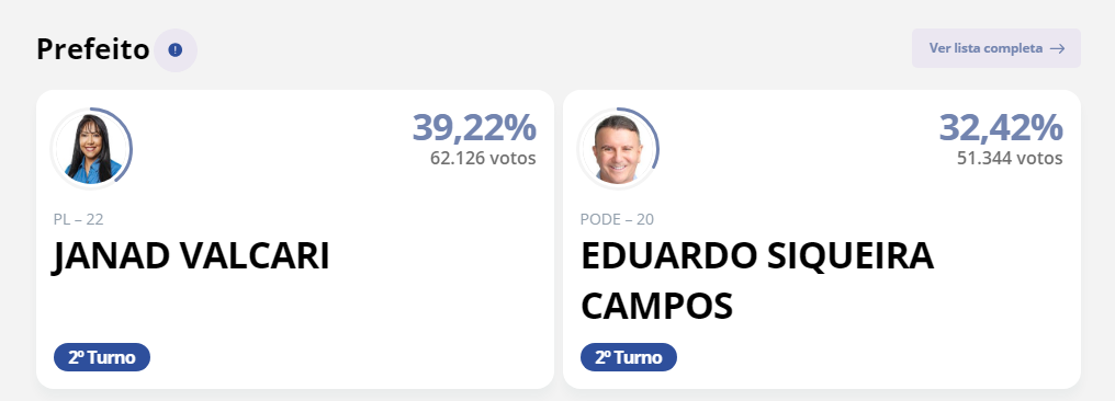 Palmas, capital de Tocantins, é mais uma que terá o segundo turno disputado por uma candidata bolsonarista e um filiado do Podemos. Janad Valcari, deputada estadual, foi a mais votada na primeira etapa da eleição, com 39,22% (62.126) dos votos válidos, e concorrerá contra Eduardo Siqueira Campos (Podemos), ex-deputado estadual, que teve 32,42% (51.344).