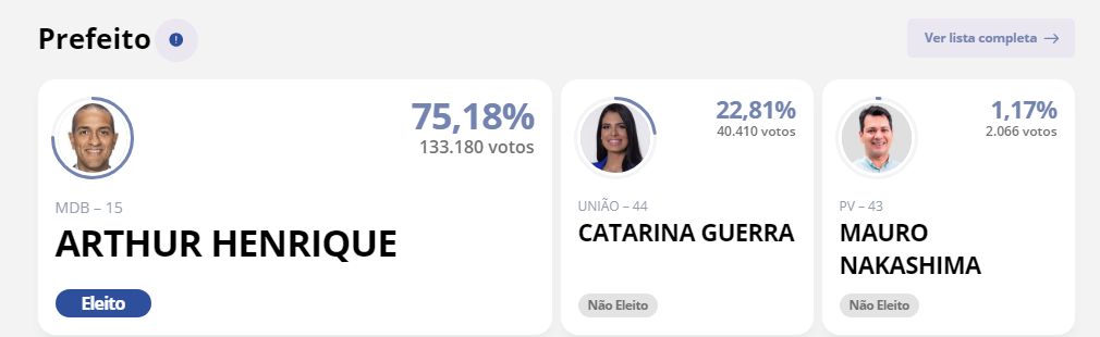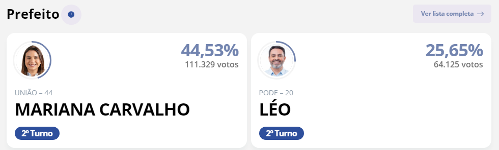 Em Porto Velho, capital de Rondônia, Mariana Carvalho (União Brasil) foi a mais votada, com 44,53% (111.329), e vai ao segundo turno com Léo Moraes (Podemos), que teve 25,65% (64.125) dos votos válidos.