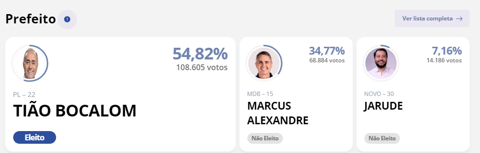 Em Rio Branco, Tião Bocalom (PL) foi reeleito prefeito no primeiro turno, com 54,82% (108.605) dos votos válidos. Anteriormente, ele já havia assumido a Prefeitura de Acrelândia, interior do Estado, por três vezes.
