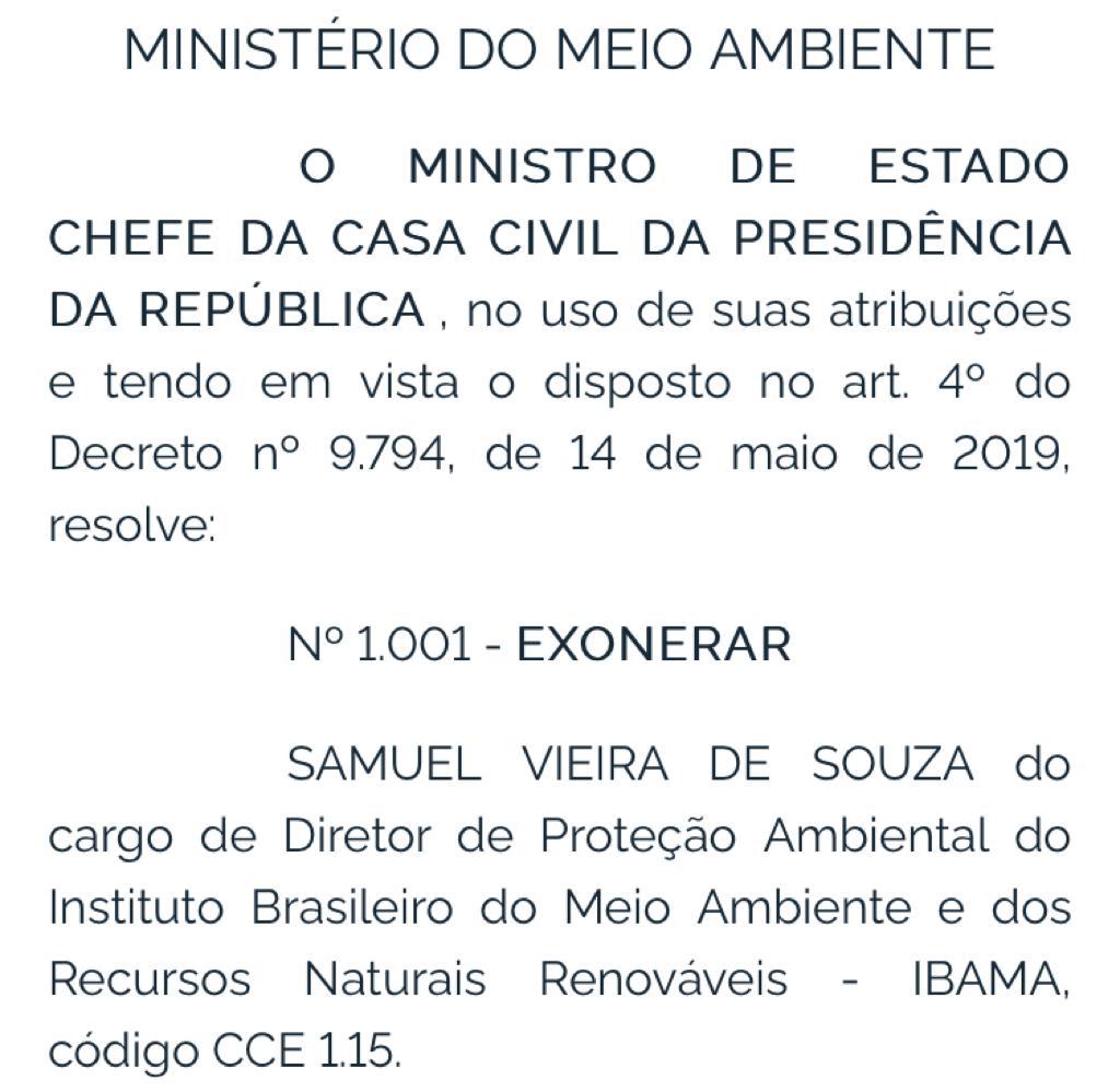 “O ministro de Estado chefe da Casa Civil da Presidência da República, no uso de suas atribuições e tendo em vista o disposto no art. 4º do Decreto nº 9.794, de 14 de maio de 2019, resolve exonerar Samuel Vieira de Souza do cargo de diretor de Proteção Ambiental do Instituto Brasileiro do Meio Ambiente e dos Recursos Naturais Renováveis – Ibama”, consta no documento.