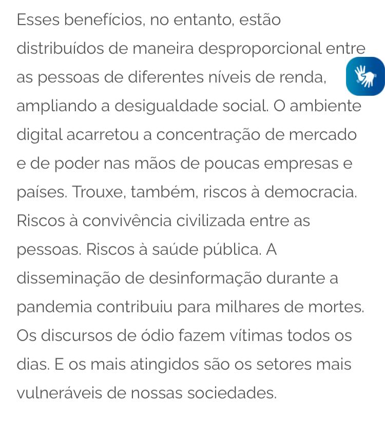 “O ambiente digital acarretou a concentração de mercado e de poder nas mãos de poucas empresas e países. Trouxe, também, riscos à democracia. Riscos à convivência civilizada entre as pessoas. Riscos à saúde pública. A disseminação de desinformação, durante a pandemia, contribuiu para milhares de mortes. Os discursos de ódio fazem vítimas todos os dias. E os mais atingidos são os setores mais vulneráveis de nossas sociedades”, afirma Lula em um dos trechos.
