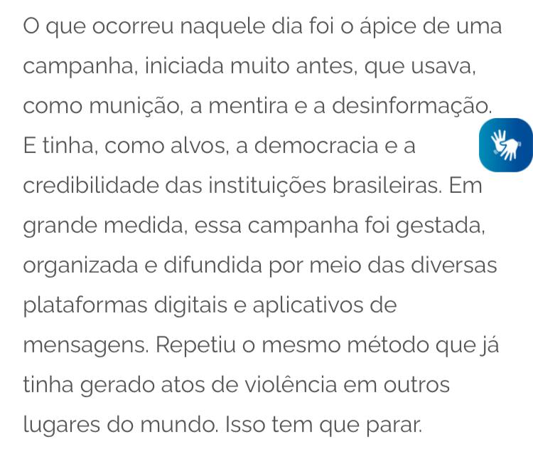 “O que ocorreu naquele dia foi o ápice de uma campanha, iniciada muito antes, que usava, como munição, a mentira e a desinformação. E tinha, como alvos, a democracia e a credibilidade das instituições brasileiras. Em grande medida, essa campanha foi gestada, organizada e difundida por meio das diversas plataformas digitais e aplicativos de mensagens. Repetiu o mesmo método que já tinha gerado atos de violência em outros lugares do mundo. Isso tem que parar“, afirmou Lula.