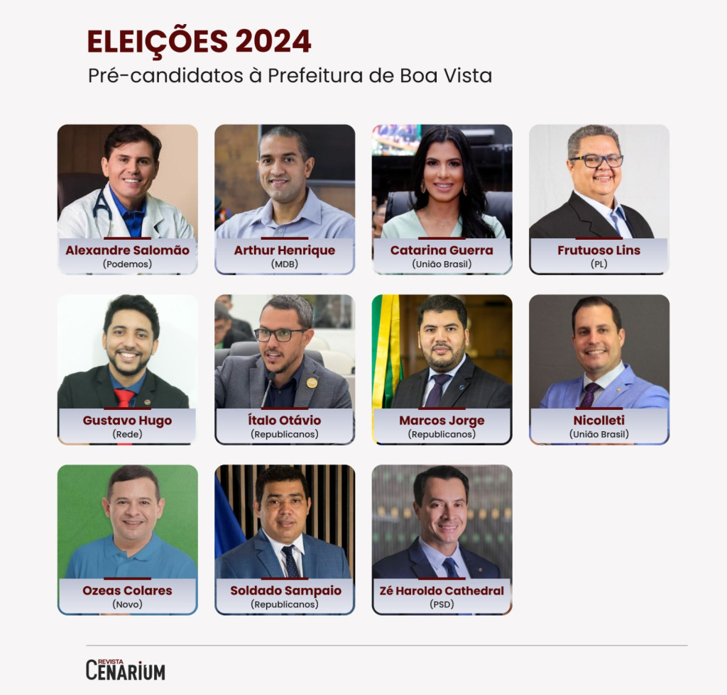 BOA VISTA (RR) – A capital de Roraima, Boa Vista, é o centro das disputas eleitorais no Estado. Até o momento, são 11 pré-candidatos à Prefeitura nas eleições municipais de 2024. O MDB, partido do atual prefeito Arthur Henrique, foi um dos primeiros a confirmar interesse na reeleição durante convenção partidária. O ex-vice-governador Frutuoso Lins (PL), o auditor fiscal Ozeas Colares (Novo) e o advogado Gustavo Hugo (Rede) também confirmaram a pré-candidatura nas redes sociais.