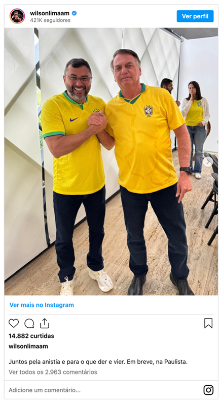 Imagem publicada no Instagram do governador do Amazonas, Wilson Lima, em que aparece de mãos dadas com Jair Bolsonaro, manifestando apoio à anistia dos criminosos que atentaram contra a democracia nos atos golpistas de 8 de janeiro.