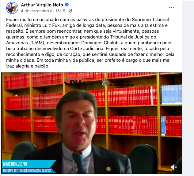Em suas redes sociais, o prefeito de Manaus expressou gratidão pelas palavras de ministro, além de reforçar o respeito pelo magistrado. “Fiquei muito emocionado com as palavras do presidente do Supremo Tribunal Federal, ministro Luiz Fux, amigo de longa data, pessoa da mais alta estima e respeito”, afirmou.