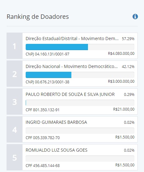 Grande parte das doações (57,29%) feitas para a campanha de Braga é da direção estadual do partido dele, o Movimento Democrático Brasileiro (MDB) o qual investiu R$4.080.000, já a Direção nacional do MDB doou ao candidato R$ 3.000.000 e o restante das doações é de pessoas físicas.