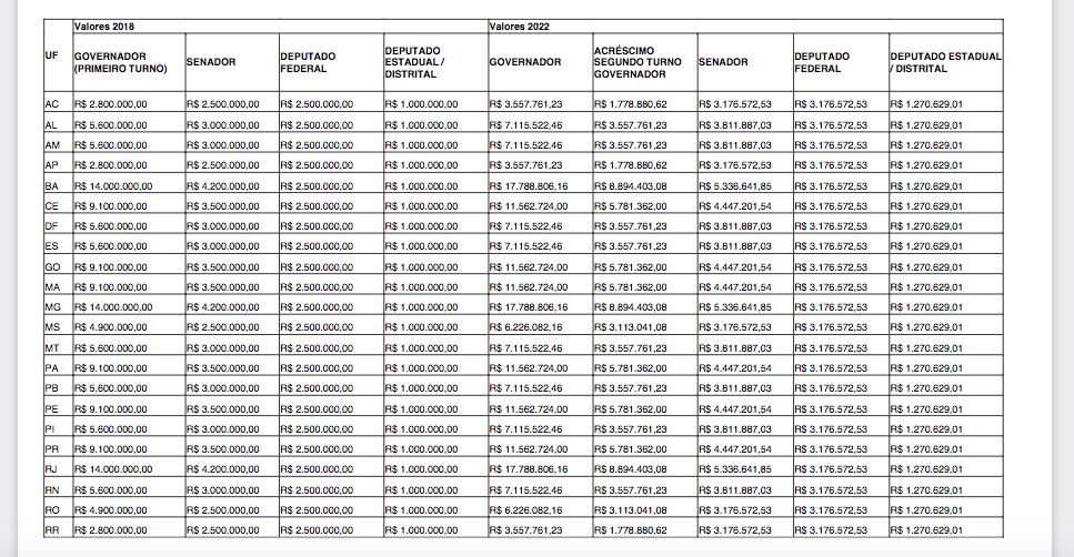 Os valores de teto de gastos são os mesmos adotados nas eleições de 2018, atualizados pelo Índice Nacional de Preços ao Consumidor Amplo (IPCA), aferido pelo Instituto Brasileiro de Geografia e Estatística (IBGE). Cada estado tem um valor definido pelo TSE para candidaturas ao governo, para o senado e para deputados estaduais e federais.