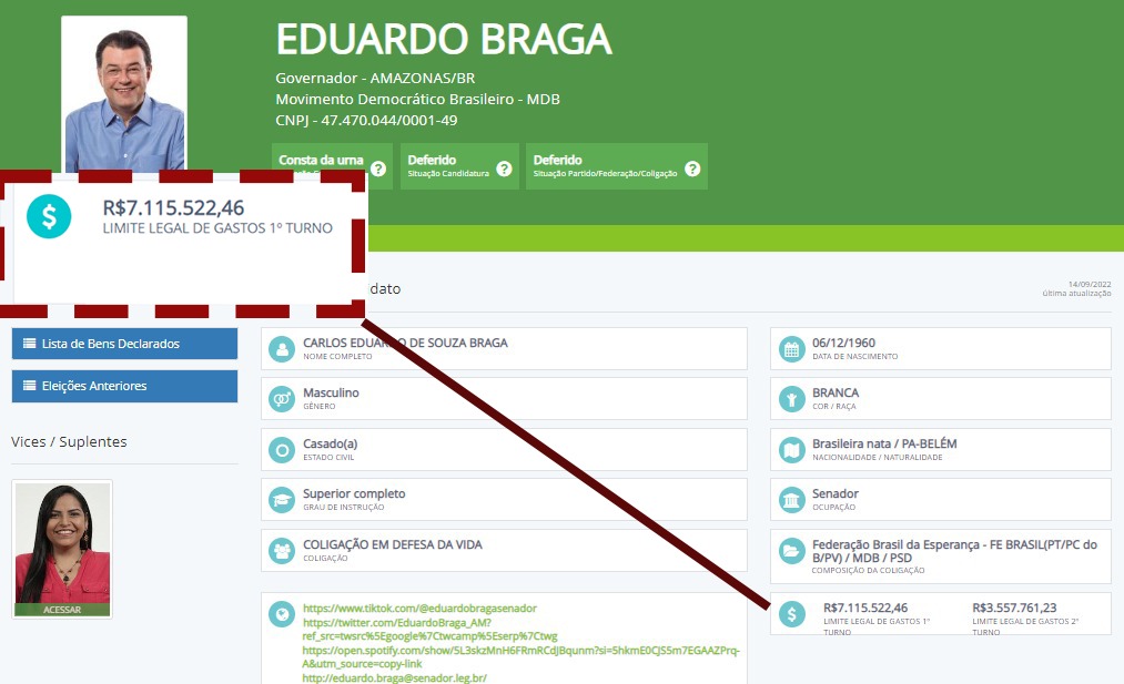 Para juristas, o quantitativo total de doações feitas à candidatura de Braga pode prejudicá-lo se ele usar todo o valor, furando o teto de gastos do TSE. “Se o candidato ou candidata ultrapassar o limite de gastos, sofrerá a penalidade de multa de 100% da quantia gasta em excesso, podendo responder por abuso de poder econômico e demais sanções cabíveis, inclusive cassação do mandato eletivo, a depender do quanto interferiu no resultado do pleito”, explicou a advogada especialista em Direito Eleitoral, Tatiana Gomes.