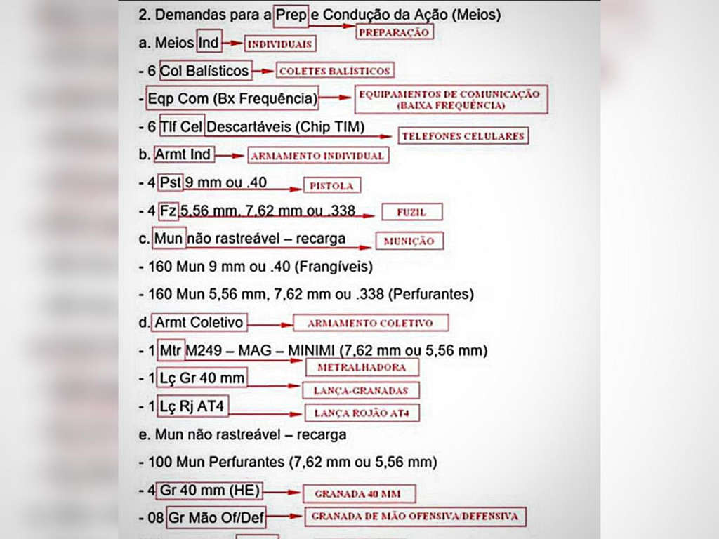 Os documentos encontrados pela PF descrevem minuciosamente as etapas do plano, incluindo logística, monitoramento e execução. As estratégias envolviam desde a vigilância de rotas até a utilização de armamentos de guerra, como pistolas, fuzis, metralhadoras, granadas e lança-rojões. Parte do arsenal incluía munições não rastreáveis, coletes à prova de balas e telefones descartáveis para evitar rastreamento.