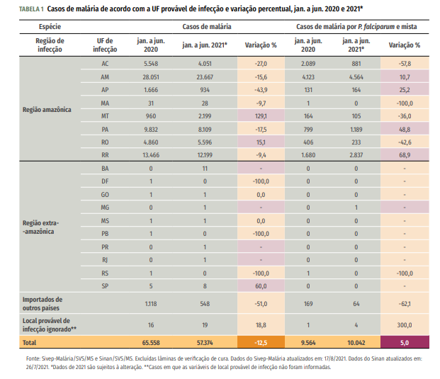 De acordo com o Boletim Epidemiológico, produzido pela Secretaria de Vigilância em Saúde (SVS), do Ministério da Saúde, divulgado em novembro de 2021, foram registrados 56.807 casos, de janeiro a junho de 2021, o que corresponde a uma diminuição de 11,8% em relação ao mesmo período do ano anterior. No Amazonas, correspondem a 23.667, o Estado com maior número de incidentes, equivalente a 41,68% do total de casos da Região Amazônica.