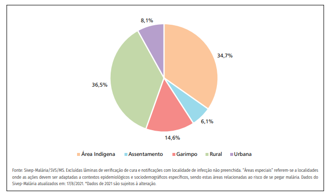 A Região Amazônica de maior área de transmissão foi a rural, com (36,5%) do total de casos, logo em seguida, as áreas indígenas (34,7%) e as áreas de garimpo (14,6%) e, por último, as urbanas (8,1%) e os assentamentos (6,1%).