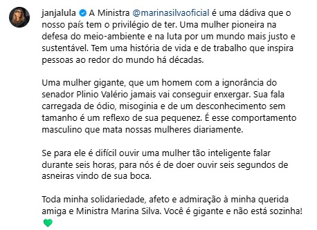 Janja ainda afirmou que Marina é uma dádiva que o Brasil tem o privilégio de ter, por causa da luta ambiental da ministra. “Uma mulher pioneira na defesa do meio ambiente e na luta por um mundo mais justo e sustentável. Tem uma história de vida e de trabalho que inspira pessoas ao redor do mundo há décadas“, acrescentou.