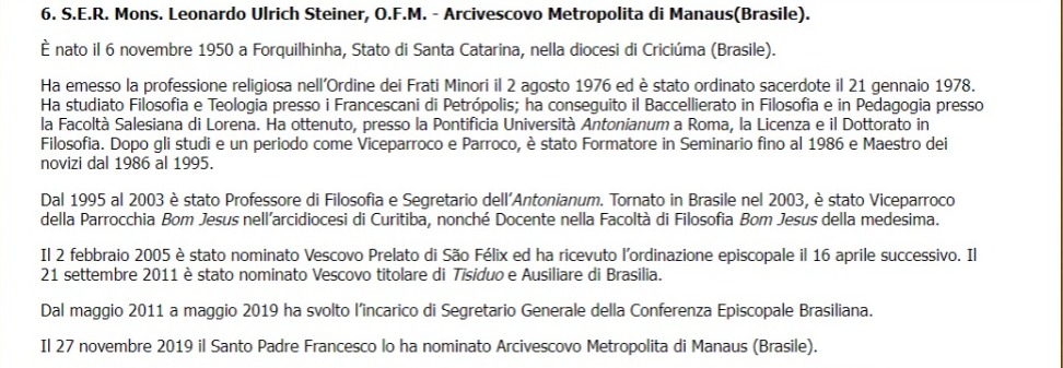 Dom Leonardo Steiner é franciscano (nomeado bispo por São João Paulo 2), foi secretário-geral da CNBB por 2 mandatos, nomeado bispo auxiliar de Brasília por Bento 16, e Arcebispo de Manaus pelo papa Francisco. Nasceu em 6 de novembro de 1950, em Forquilhinha, Estado de Santa Catarina, na diocese de Criciúma (Brasil).