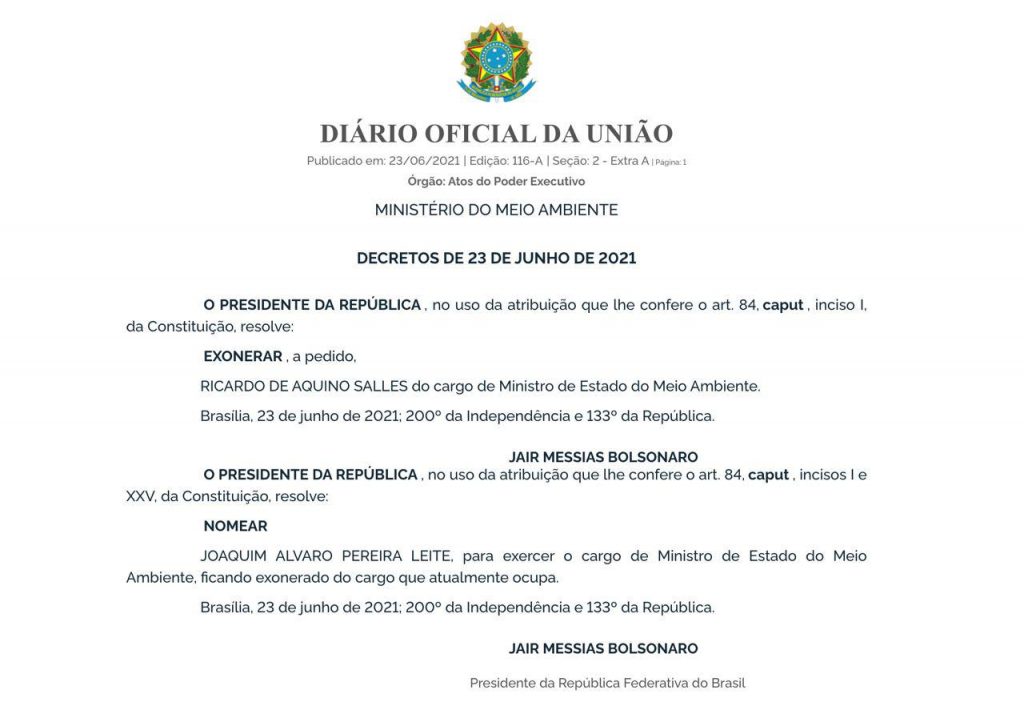 Nesta quarta-feira, 23, Salles pediu demissão. O ato de exoneração foi publicado em edição extra do Diário Oficial da União (DOU) e o atual Secretário da Amazônia e Serviços Ambientais da pasta, Joaquim Álvaro Pereira Leite, foi nomeado para o cargo.