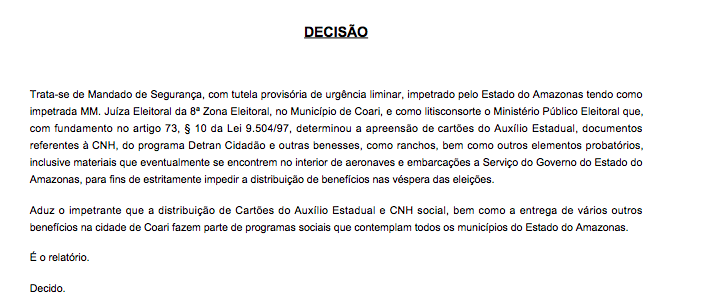 A falsa informação foi veiculada por um site de Manaus (AM). Na tarde desta sexta-feira, o desembargador Kon Tsih Wang entendeu que a execução de programas sociais estaduais deve ser mantida com o devido acompanhamento de órgãos competentes, como a Justiça Eleitoral e Ministério Público Eleitoral. O desembargador autorizou a distribuição dos benefícios, após um Mandado de Segurança ser impetrado pelo Governo do Amazonas.