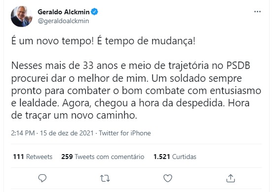 “É um novo tempo! É tempo de mudança! Nesses mais de 33 anos e meio de trajetória no PSDB procurei dar o melhor de mim. Um soldado sempre pronto para combater o bom combate com entusiasmo e lealdade. Agora, chegou a hora da despedida. Hora de traçar um novo caminho”, escreveu o ex-governador, que completou: “Valeu cada obstáculo vencido, cada momento vivido, cada conquista feita. Em breve, anunciarei meus próximos passos”.
