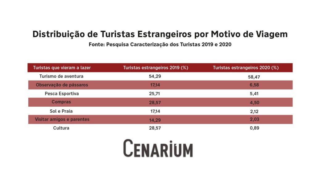 O turismo de aventura foi o mais buscado pelos turistas estrangeiros e a prática foi a única que registrou crescimento em 2020, de 4,18%. Apesar de ser alguns dos mais procurados, a observação de pássaros e pesca esportiva registraram queda no comparativo entre os anos.