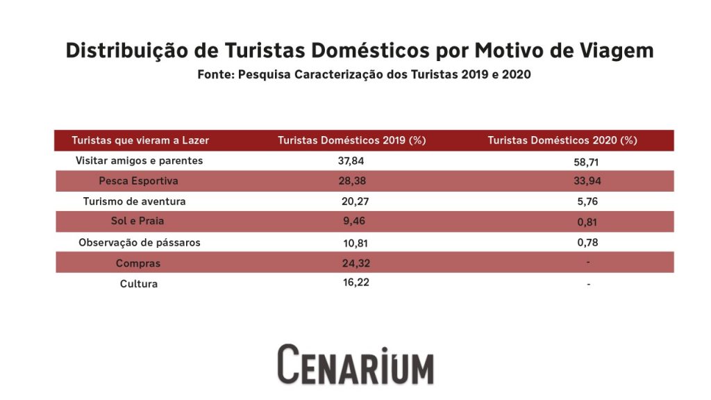 A viagem para visitar amigos e parentes teve aumento de 20,87%, assim como a pesca esportiva com aumento de 5,56%. O turismo de aventura não teve aumento e continuou entre as lideranças da lista.