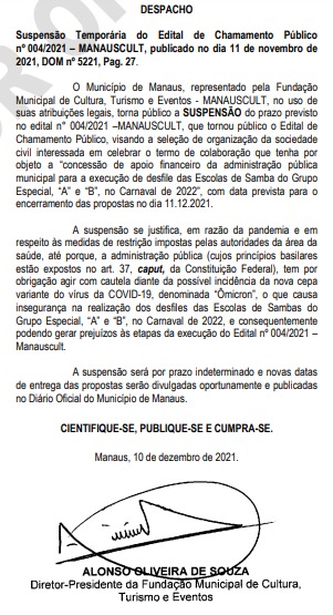 A suspensão foi justificada também pela chegada da variante Ômicron no Brasil, que tem alertado cada vez mais as autoridades de saúde e causado insegurança na realização dos desfiles em 2022 e, consequentemente, podendo gerar prejuízos às etapas da execução do Edital nº 004/2021. A prefeitura destaca também que novas datas de entrega das propostas serão divulgadas e publicadas no DOM.