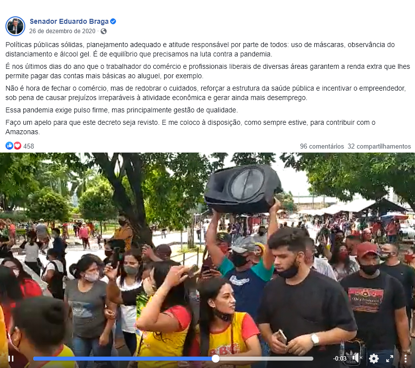 No dia 26 de dezembro, 20 dias antes do Amazonas sofrer com a escassez de oxigênio medicinal em razão do aumento do consumo nas unidades de saúde, o senador Eduardo Braga (MDB) defendeu a abertura do comércio no Estado durante publicação em uma rede social. A postura do político é diferente da adotada durante depoimentos da CPI da Pandemia onde, aparentemente, defende medidas de distanciamento e de segurança sanitária contra o novo coronavírus.