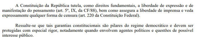 Costa Neto também citou que, “embora seja igualmente assegurado o direito à imagem, à honra e à vida privada (art. 5º, X, da CF/88), a ponderação entre esses direitos deve levar em conta o interesse público da informação, o contexto da divulgação e a função social da imprensa como instrumento de controle social”.
